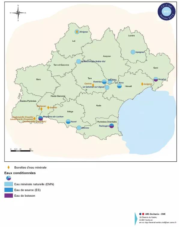 L’Occitanie compte 12 sites de conditionnement d’eau et 8 buvettes publiques alimentées par de l’eau minérale naturelle (dont 3 sont situées sur la commune de Loudenvielle). La carte ci-dessous indique les communes d’implantation des sites de conditionnement de la région. Le tableau ci-dessous rapporte pour chaque site de conditionnement, les dénominations de vente et désignations commerciales des produits commercialisés. Les captages exploités seuls ou en mélange sont indiqués.