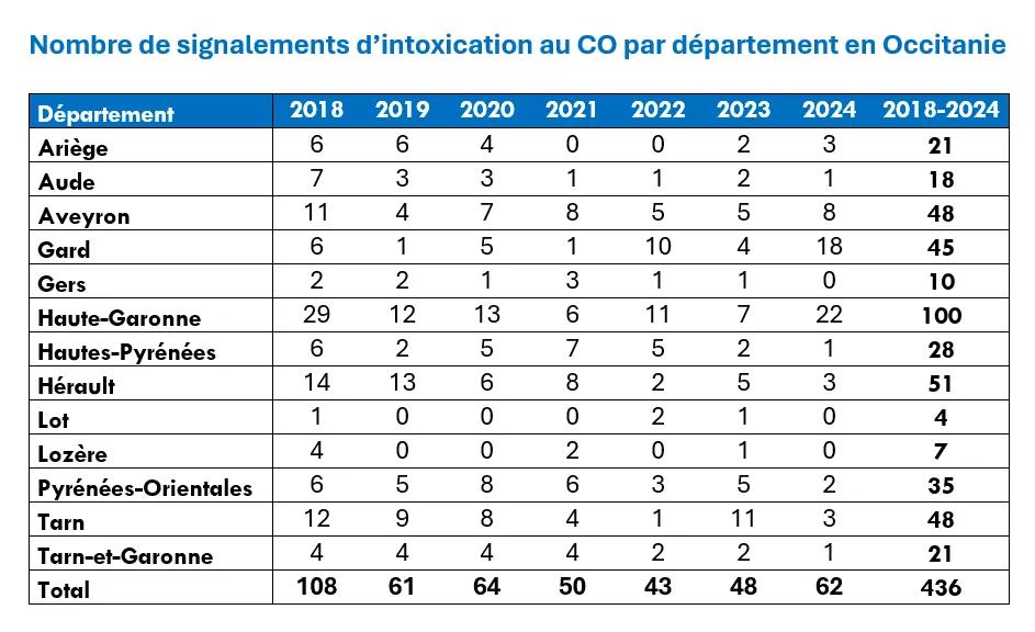 Chaque année en France, près de 3 000 personnes sont victimes d’une intoxication accidentelle au monoxyde de carbone, dont une centaine décèdent. En Occitanie, 62 intoxications ont été recensées en 2024 et 7 décès sont à déplorer depuis 2018. La majorité des intoxications résulte d’un mauvais usage des appareils à combustion ou d’un défaut d’entretien.