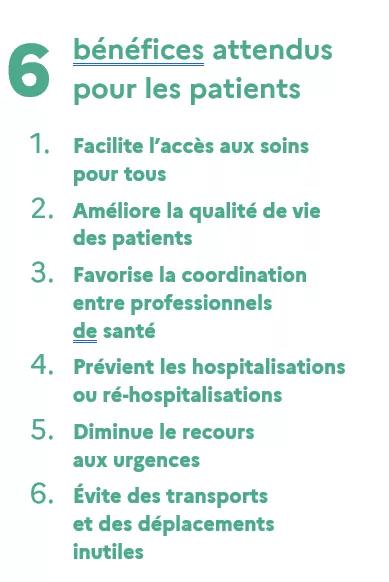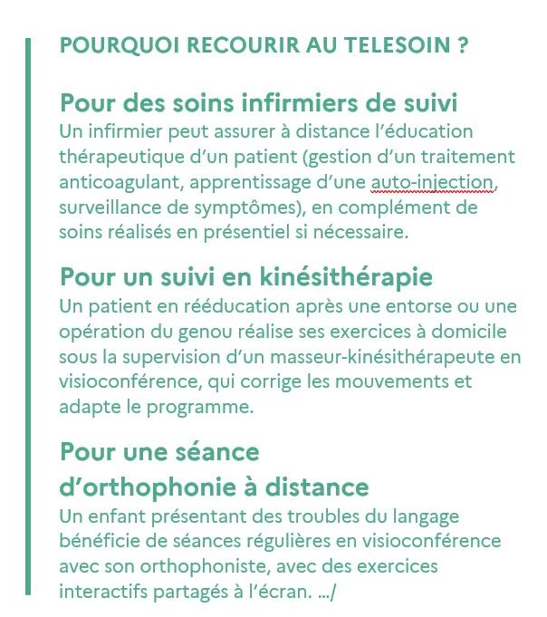 d’avis spécialisés ou du suivi régulier de patients, notamment ceux atteints de maladies chroniques. Elle comporte 2 domaines d’activités : La télémédecine pour les activités réalisées à distance par un professionnel médical (médecin, sage-femme, chirurgien-dentiste) et le télésoin pour les activités réalisées à distance par un professionnel paramédical ou par un pharmacien.