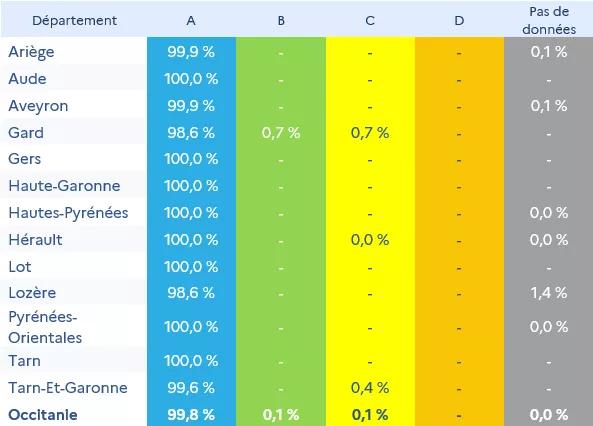 - 0,1 % de la population (6212 personnes, 3 réseaux dans le Gard, 1 réseau dans l’Hérault et dans le Tarn et Garonne) est alimentée par une eau de qualité C (eau de qualité insuffisante) : il y a eu plusieurs dépassements de la norme de 50 mg/L en 2024